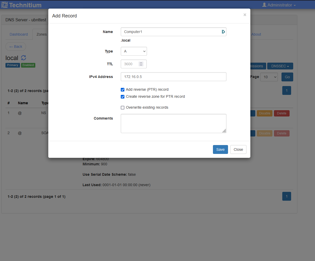 5. After you make the zone you can add which ever records you want. You will want to add a revers PTR record and a reverse zone for the record if you dont have one already. This will allow you to look up the DNS name via IP.