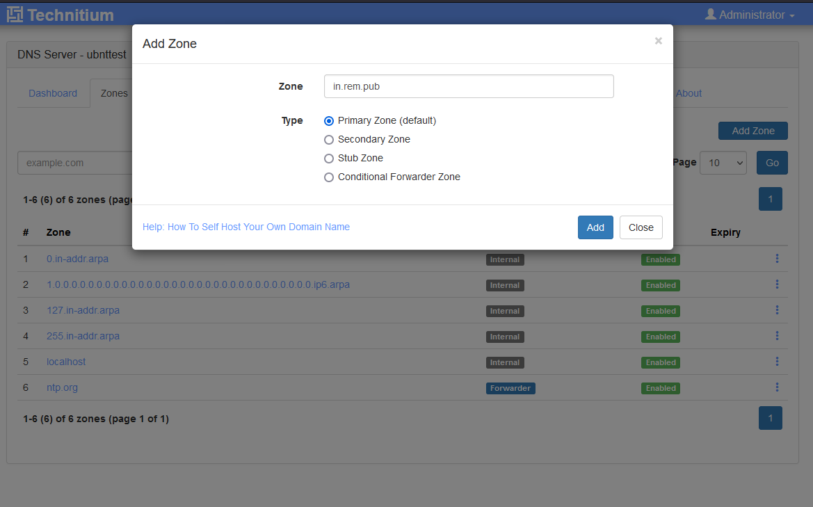 4. Reload the webpage and login again, then we will go to the Zones tab and add our first zone. You should select Primary Zone and enter your domain name, it should be a sub domain of an external domain you own, in this case I use in.rem.pub, "in" being short for internal and is easy to type, but it could be anything that isn't accessible from the outside. If you don't have an external domain name I recommend just typing in "local" as the zone name.